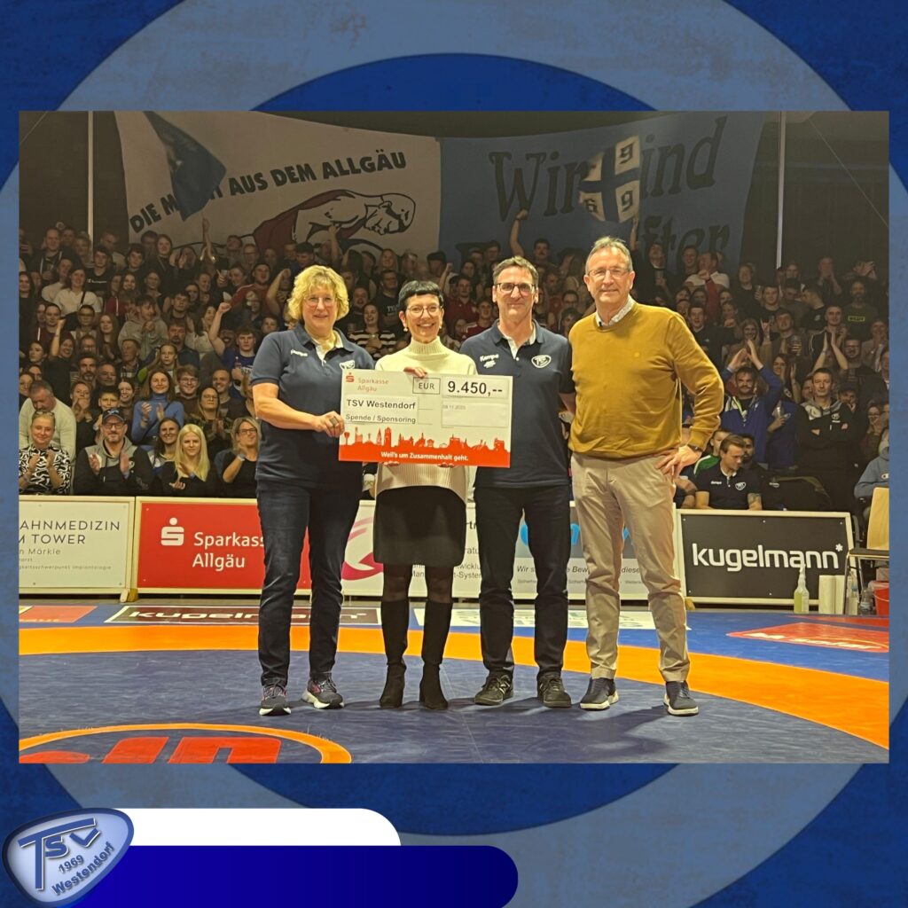 Die Sparkasse Allgäu übergab dem TSV Westendorf beim Heimkampf gegen Oberölsbach eine Spende in Höhe von 3.500 € für die Jugendarbeit. Zusammen mit dem Sponsoring unterstützt die Sparkasse Allgäu in diesem Jahr den TSV Westendorf mit insgesamt 9.450€. Dafür und für die langjährige zuverlässige Partnerschaft bedankt sich der TSV Westendorf ganz herzlich bei der Sparkasse Allgäu!
